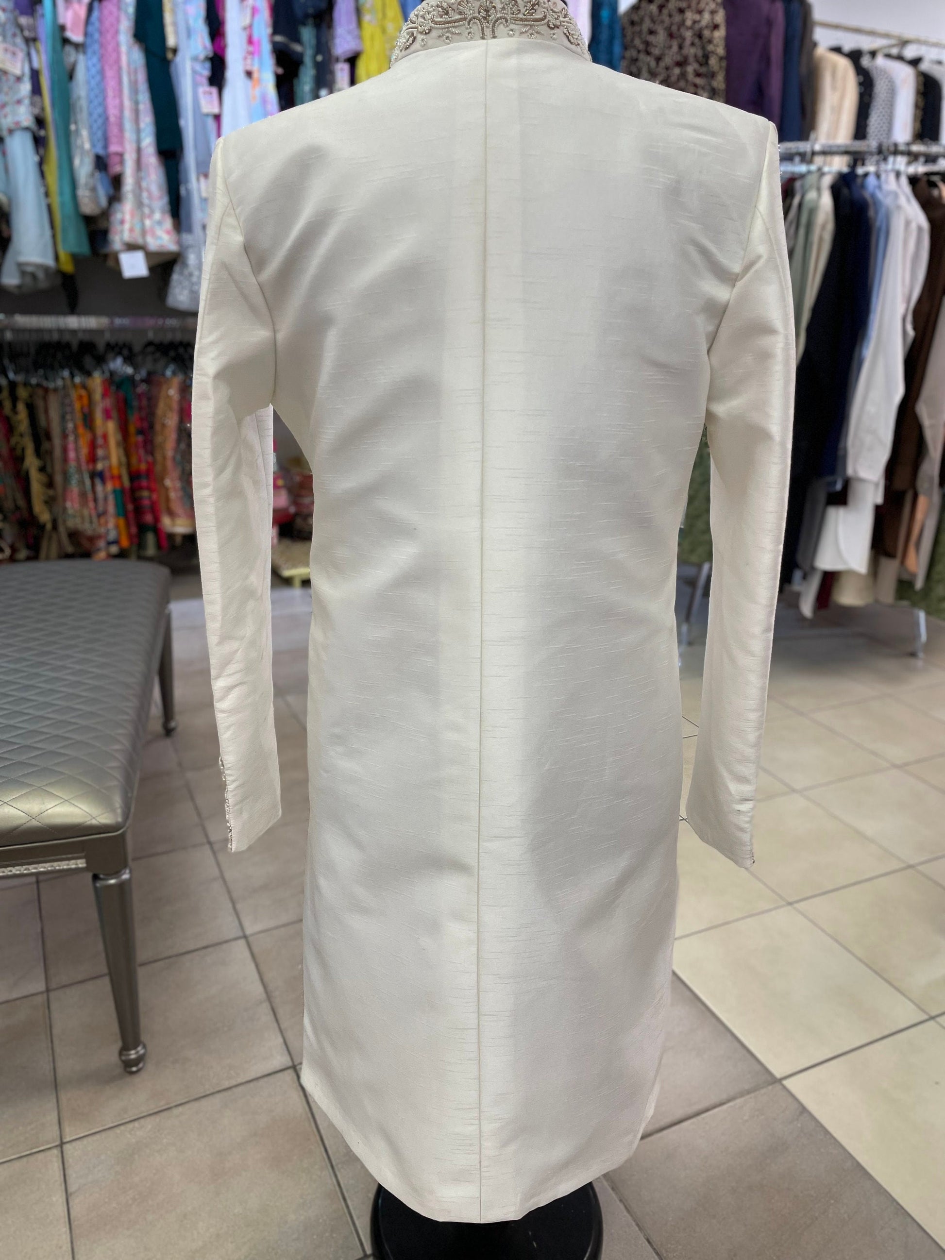 Featuring this absolutely gorgeous sherwani with hand thread work. This stunning sherwani coat is an exceptionally dressy outfit for weddings and other celebrations. This trendy outfit is all you need to up your ethnic game. You can pair it with any pants of your choice.
