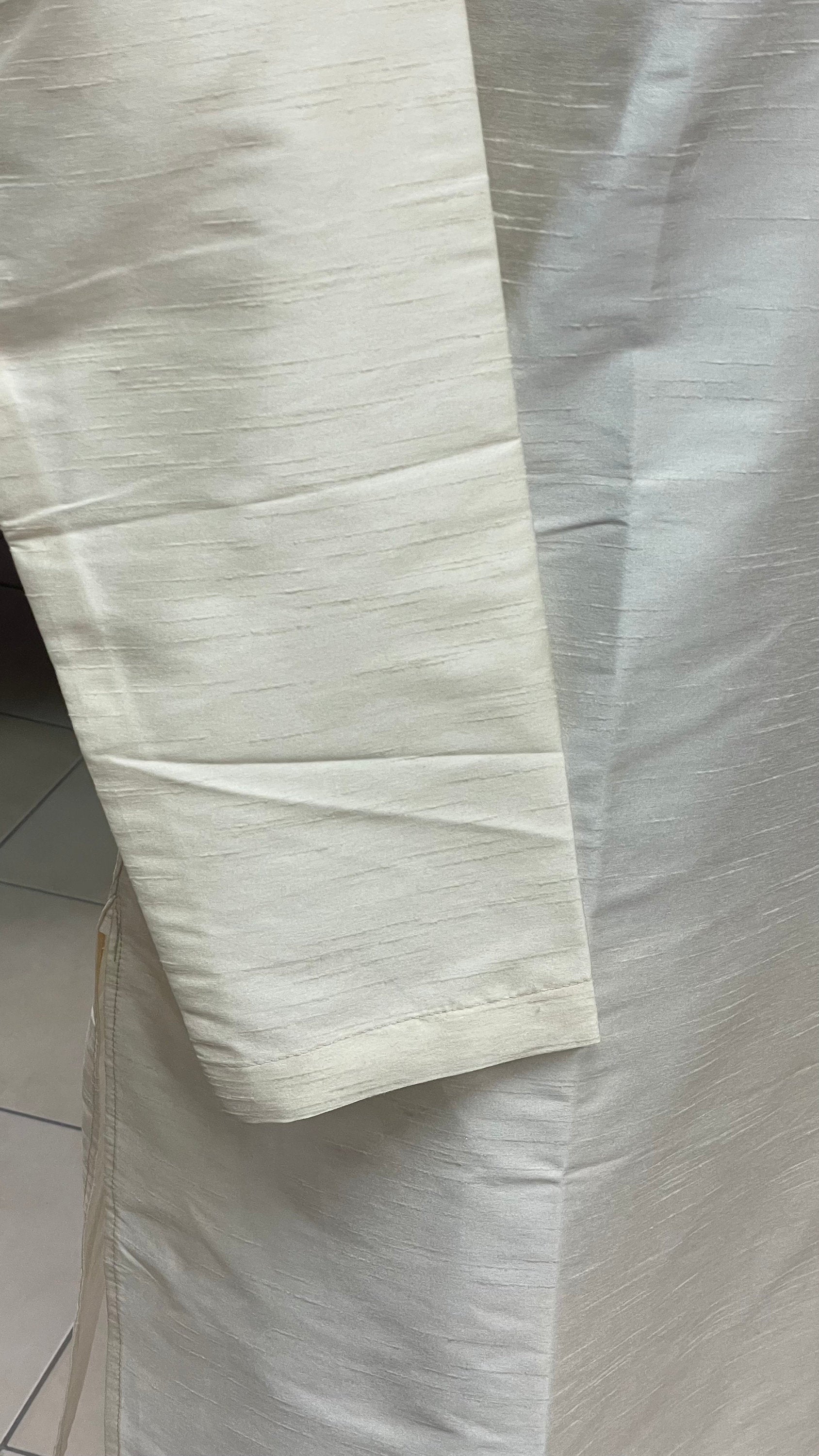 Featuring this absolutely gorgeous off-white indo western buttoned coat (sherwani) with hand embroidery and thread work. This stunning Indo Western Coat is an exceptionally dressy outfit for weddings and other celebrations. This trendy outfit is all you need to up your ethnic game. You can pair it with any pants of your choice.