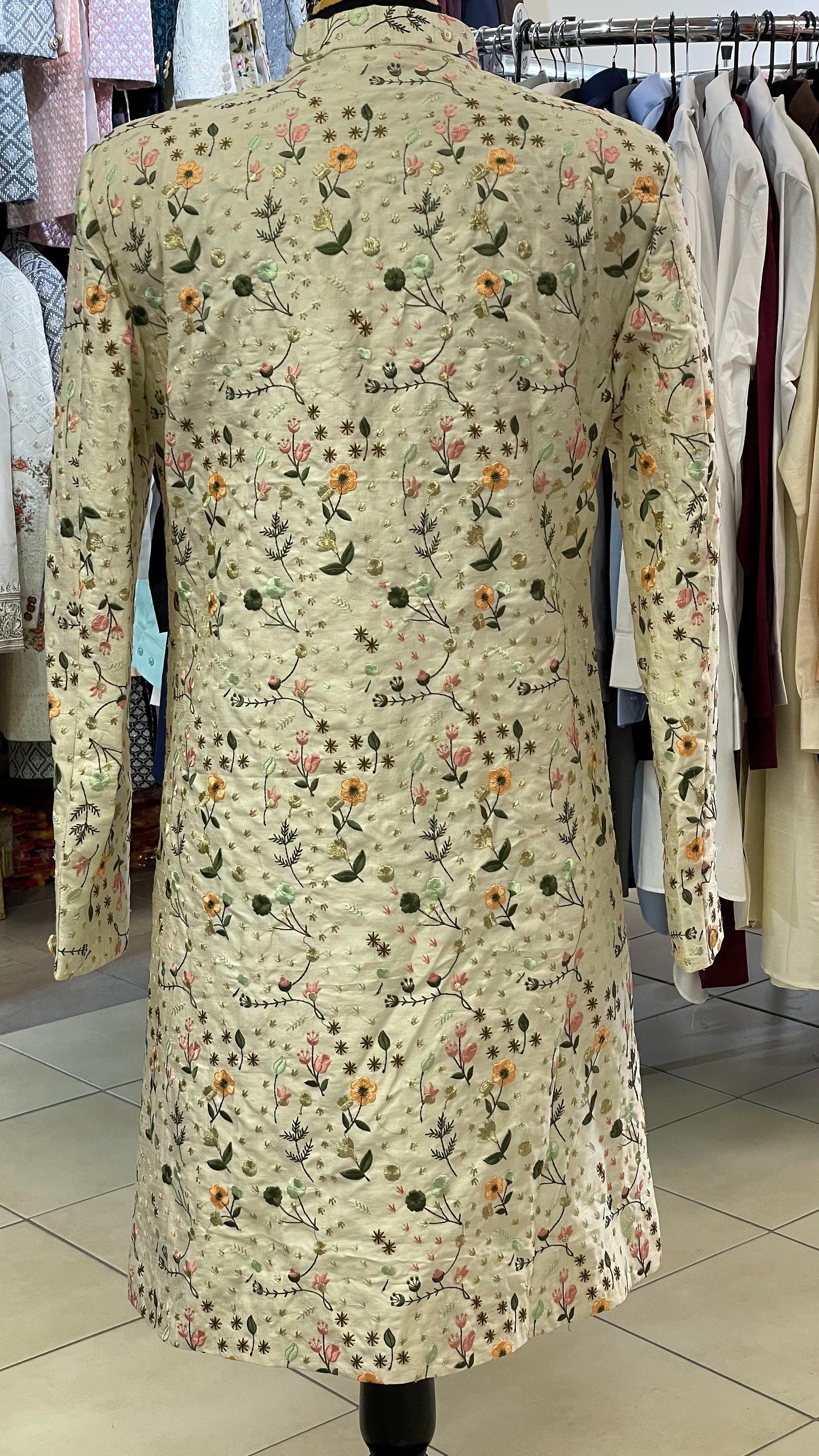Featuring this absolutely gorgeous white multicolored indo western buttoned coat (sherwani) with hand embroidery and thread work. This stunning Indo Western Coat is an exceptionally dressy outfit for weddings and other celebrations. This trendy outfit is all you need to up your ethnic game. You can pair it with any pants of your choice.